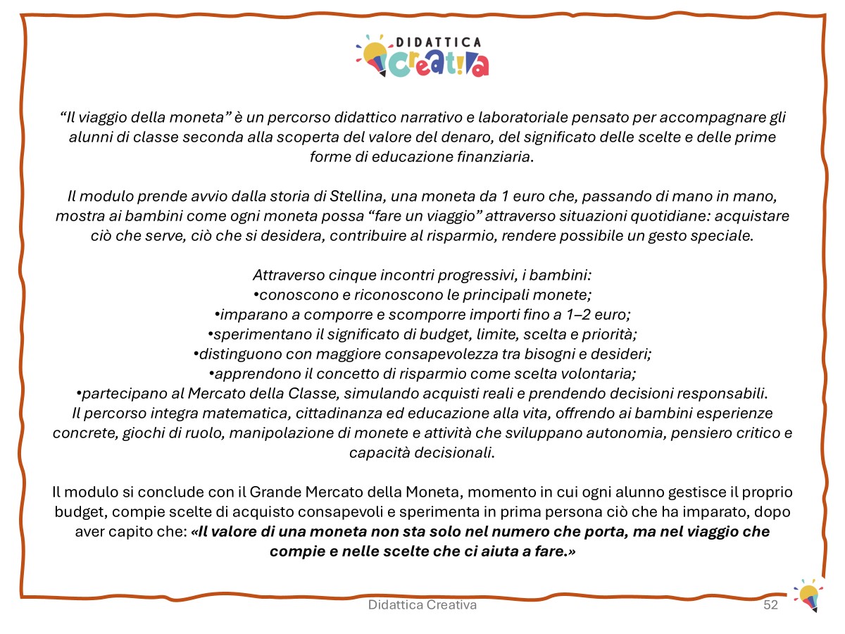 Il percorso prende avvio dalla storia di Stellina, una moneta da 1 euro che, passando di mano in mano, mostra ai bambini come ogni moneta possa “fare un viaggio” attraverso situazioni quotidiane: acquistare ciò che serve, ciò che si desidera, contribuire al risparmio, rendere possibile un gesto speciale. Il modulo si conclude con il Grande Mercato della Moneta, momento in cui ogni alunno gestisce il proprio budget, compie scelte di acquisto consapevoli e sperimenta in prima persona ciò che ha imparato, dopo aver capito che: «Il valore di una moneta non sta solo nel numero che porta, ma nel viaggio che compie e nelle scelte che ci aiuta a fare.» Il fie comprende tutto il materiale utile per le attività.