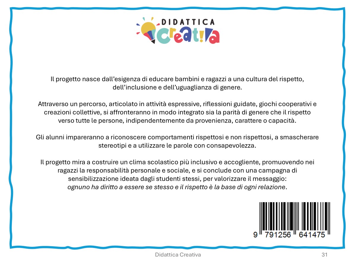 Attraverso un percorso, articolato in attività espressive, riflessioni guidate, giochi cooperativi e creazioni collettive, si affronteranno in modo integrato sia la parità di genere che il rispetto verso tutte le persone, indipendentemente da provenienza, carattere o capacità.