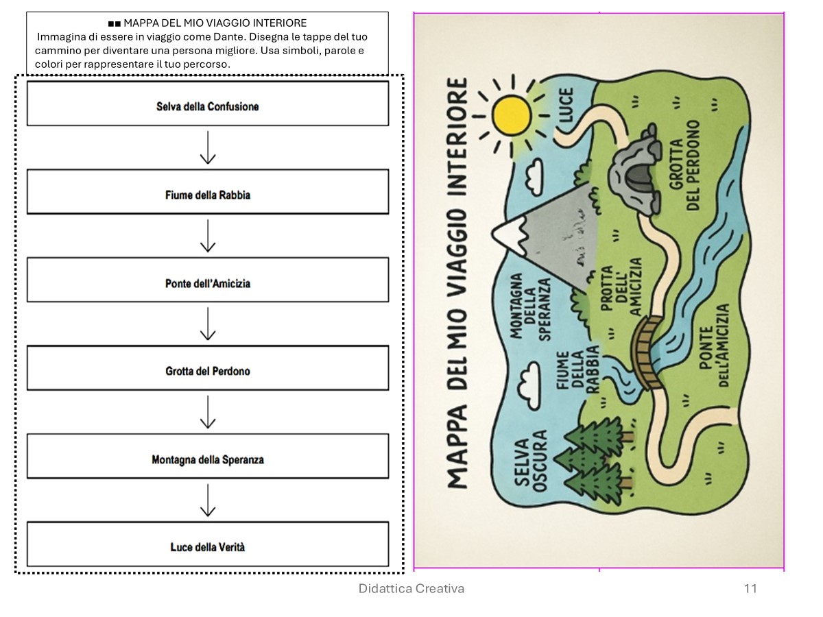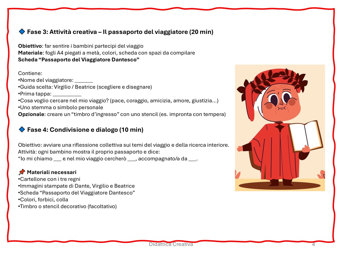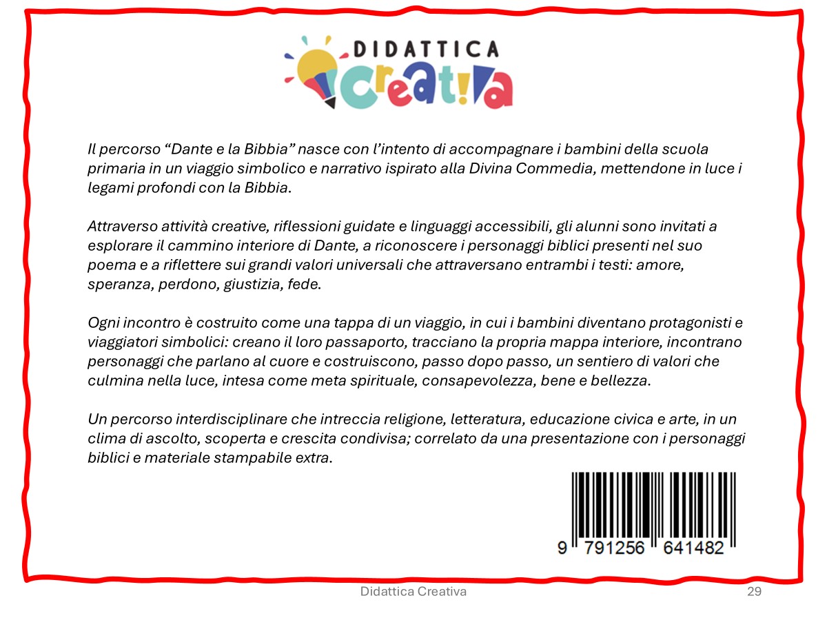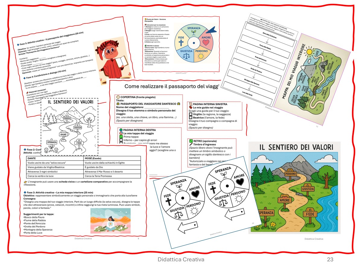 Attraverso attività creative, riflessioni guidate e linguaggi accessibili, gli alunni sono invitati a esplorare il cammino interiore di Dante, a riconoscere i personaggi biblici presenti nel suo poema e a riflettere sui grandi valori universali che attraversano entrambi i testi: amore, speranza, perdono, giustizia, fede.
