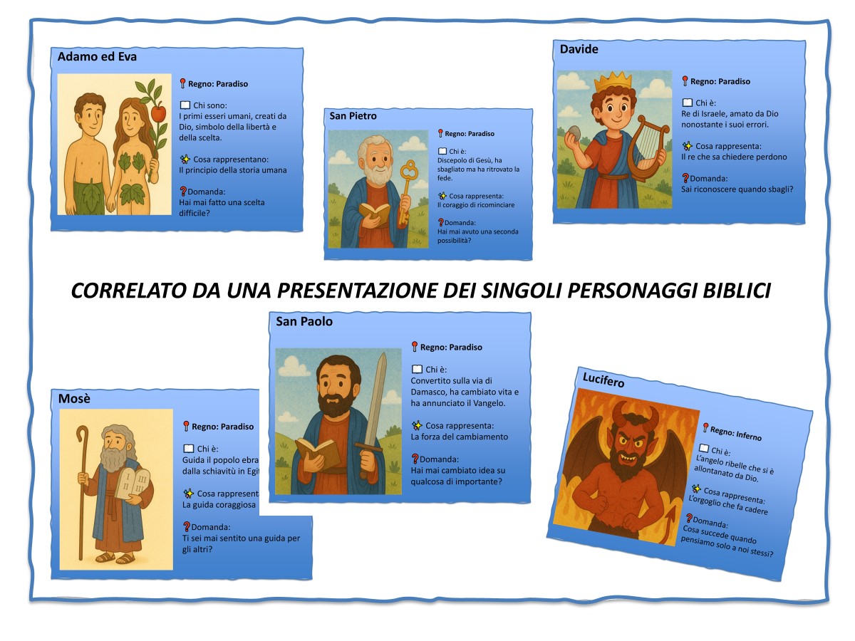 Un percorso interdisciplinare che intreccia religione, letteratura, educazione civica e arte, in un clima di ascolto, scoperta e crescita condivisa; correlato da una presentazione con i personaggi biblici e materiale stampabile extra. Il kit comprende tutto il materiale stampabile, schede e file di presentazione dei personaggi.