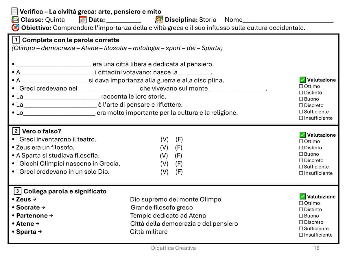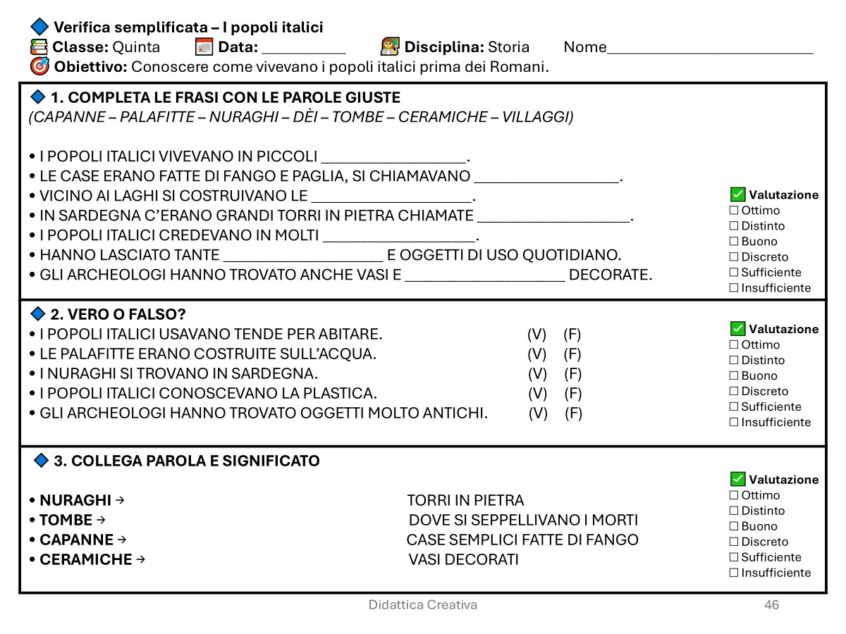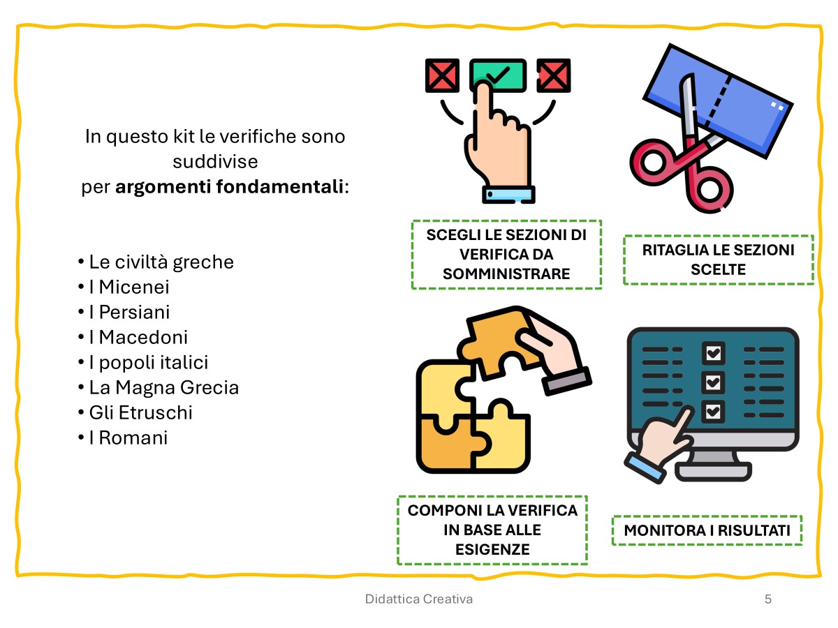 Le verifiche componibili (89 pagine) sono progettate per adattarsi ai diversi livelli di apprendimento degli alunni. Ogni verifica è articolata in tre versioni, che permettono al docente di personalizzare la somministrazione in base ai bisogni educativi degli studenti, garantendo equità e accessibilità.