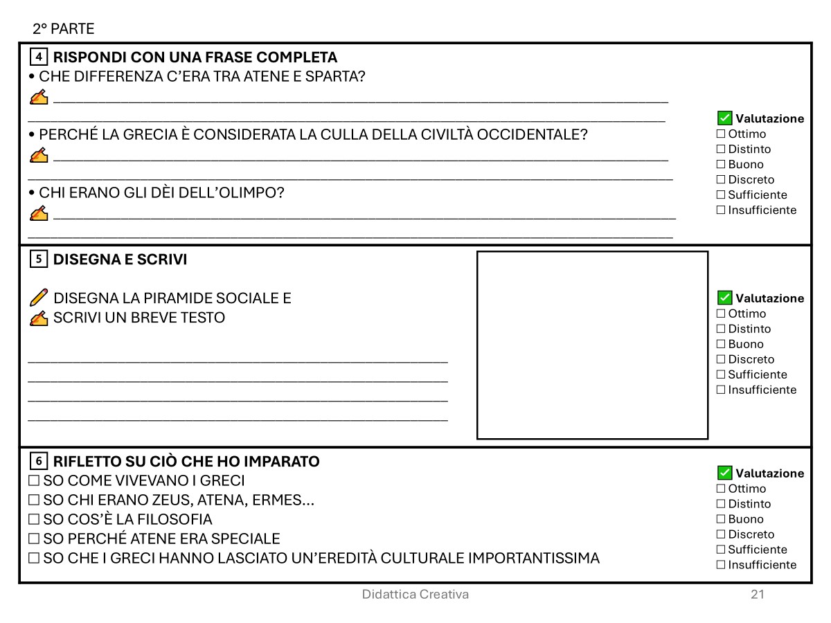 Alla fine di ogni verifica è presente una sezione metacognitiva in cui l’alunno riflette sul proprio percorso, risponde a semplici domande sul grado di comprensione, sull’impegno percepito e sulle strategie utilizzate. Uno strumento utile per promuovere autoconsapevolezza e responsabilità nel processo di apprendimento.
