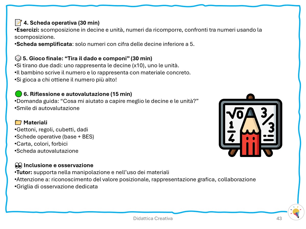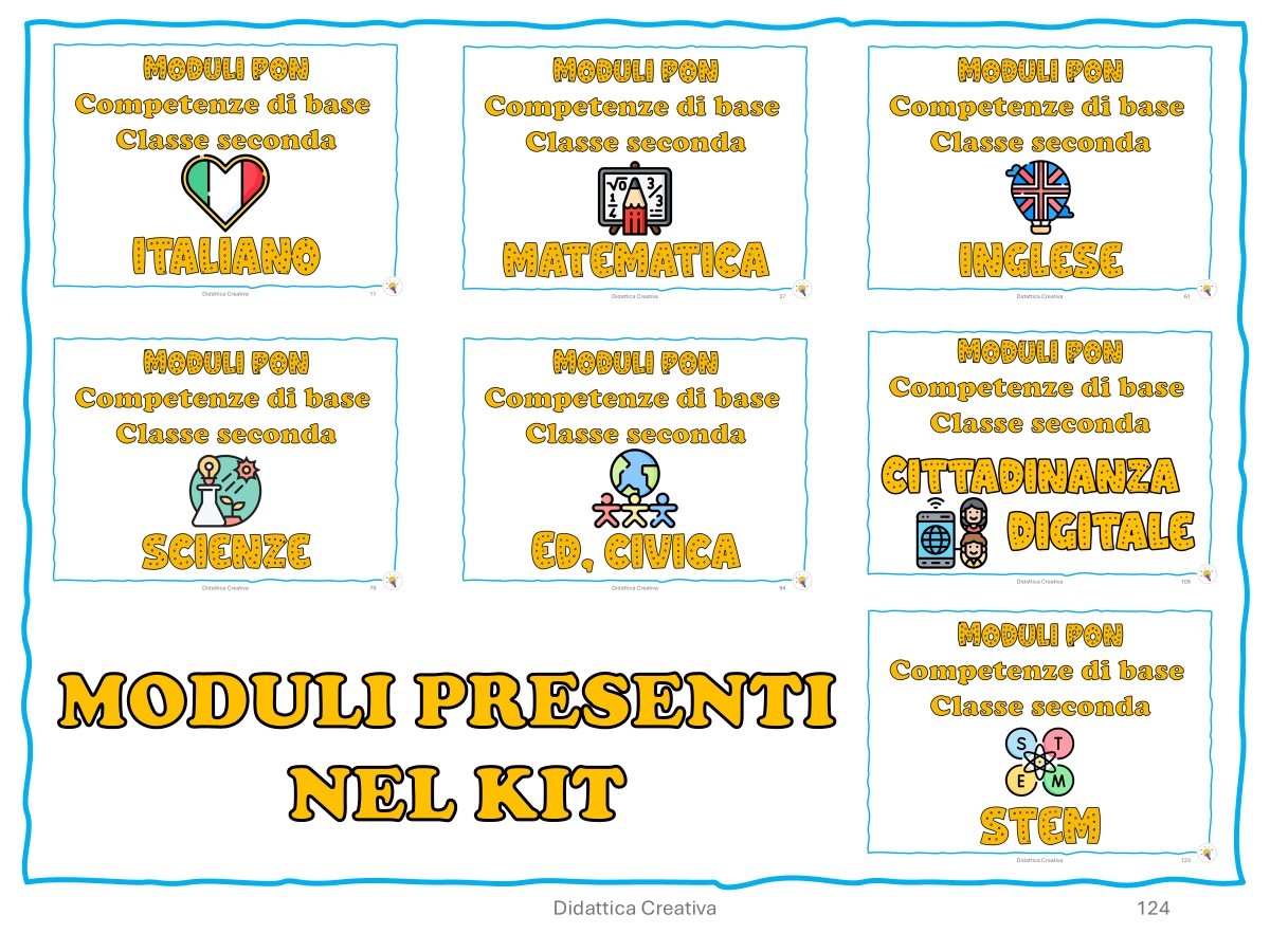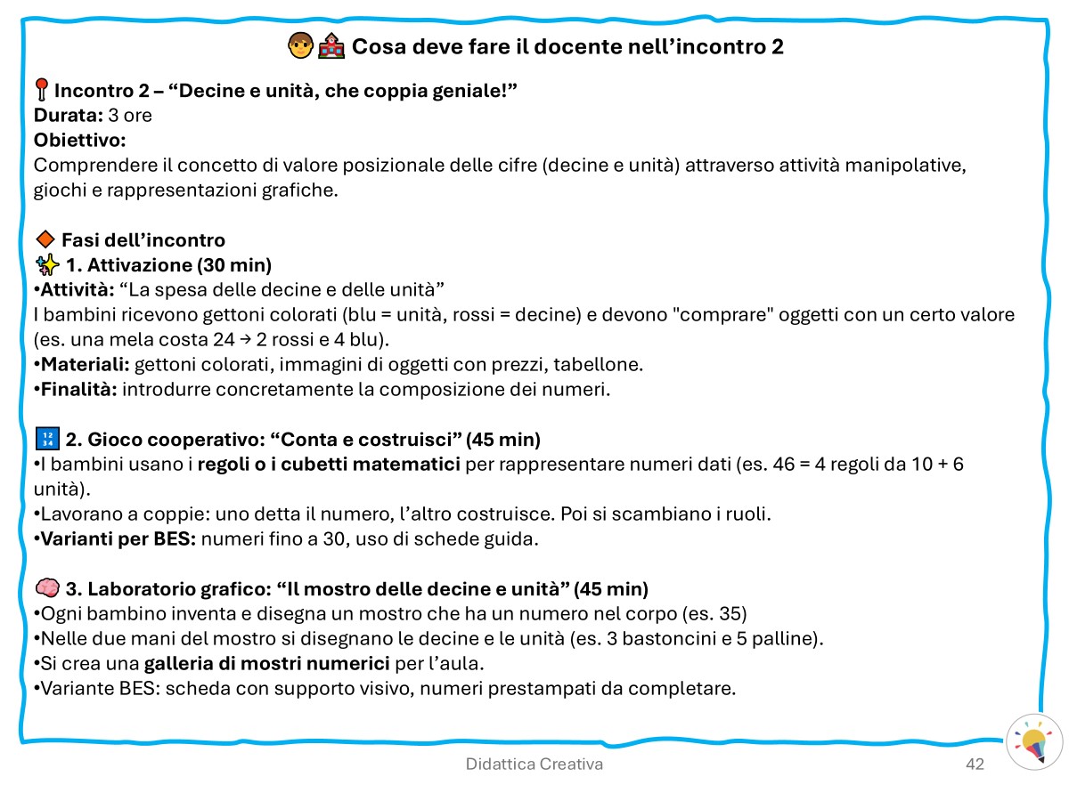 Nel libro sono inclusi 7 moduli già sviluppati, ognuno articolato in 10 incontri dettagliati, pensati per valorizzare l’apprendimento attraverso esperienze pratiche, inclusive e motivanti.