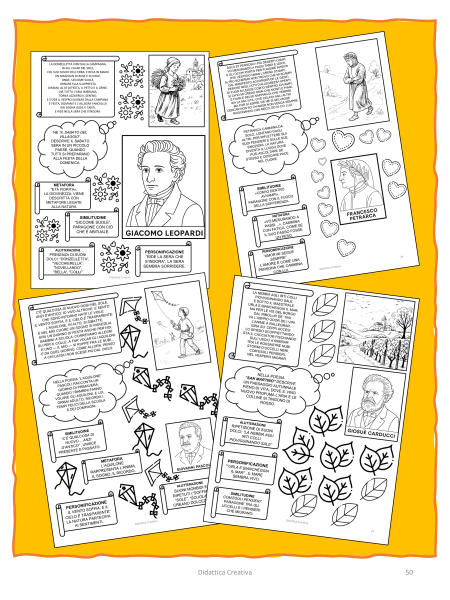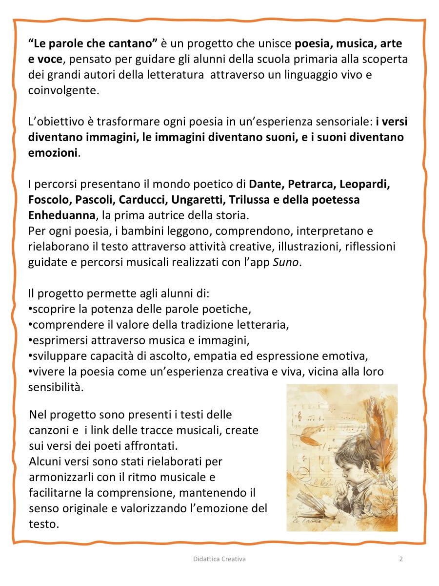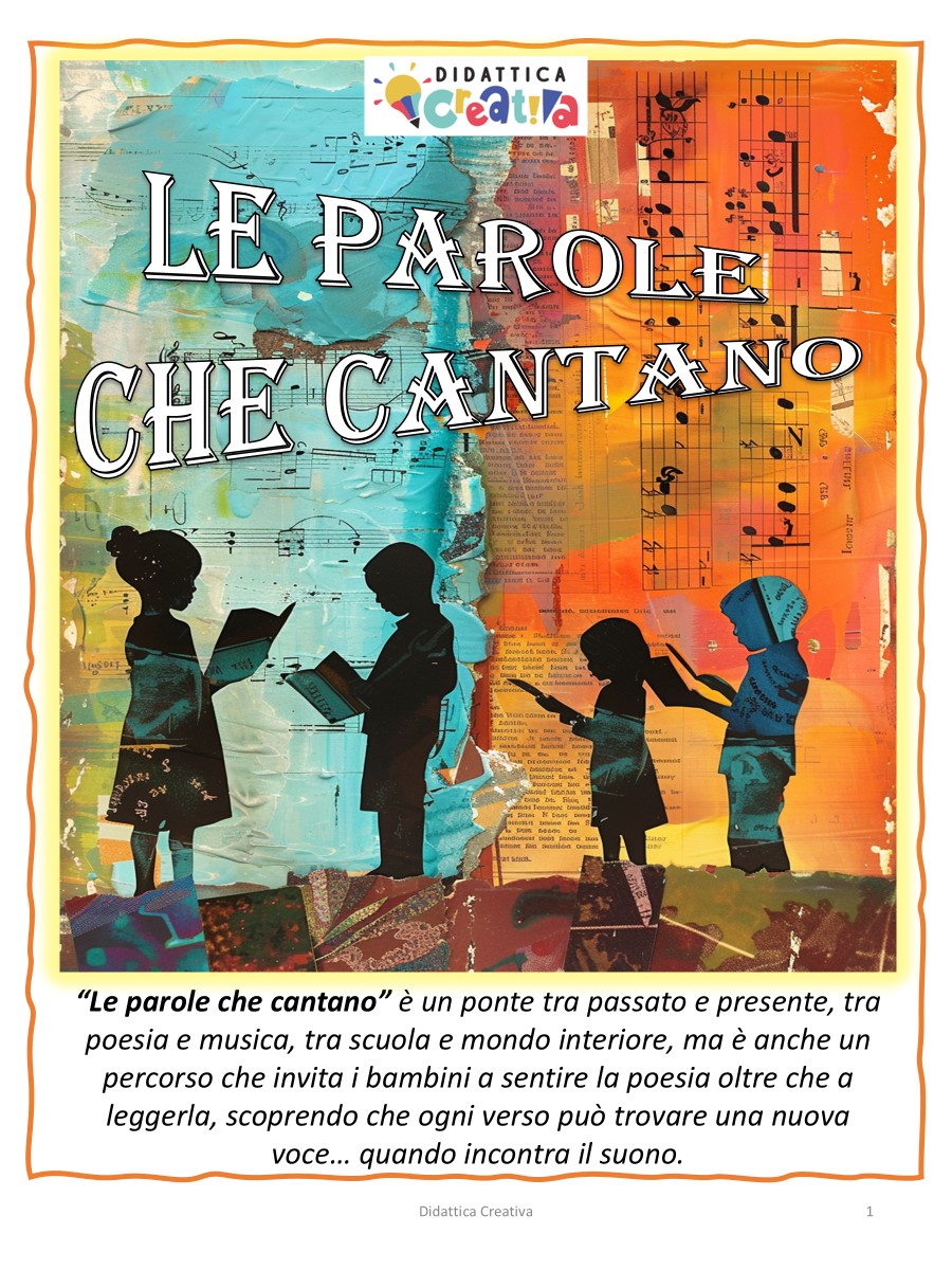 “Le parole che cantano” è un progetto che unisce poesia, musica, arte e voce, pensato per guidare gli alunni della scuola primaria alla scoperta dei grandi autori della letteratura attraverso un linguaggio vivo e coinvolgente. L’obiettivo è trasformare ogni poesia in un’esperienza sensoriale: i versi diventano immagini, le immagini diventano suoni, e i suoni diventano emozioni. I percorsi presentano il mondo poetico di Dante, Petrarca, Leopardi, Foscolo, Pascoli, Carducci, Ungaretti, Trilussa e della poetessa Enheduanna, la prima autrice della storia. Per ogni poesia, i bambini leggono, comprendono, interpretano e rielaborano il testo attraverso attività creative, illustrazioni, riflessioni guidate e percorsi musicali realizzati con APP digitali. Il libro comprende la progettazione, le attività, il materiale stampabile per lavorare sul quaderno, i testi e i link delle canzoni adattate (alcuni versi sono stati rielaborati per armonizzarli con il ritmo musicale e per facilitarne la comprensione).