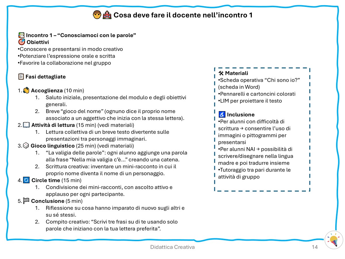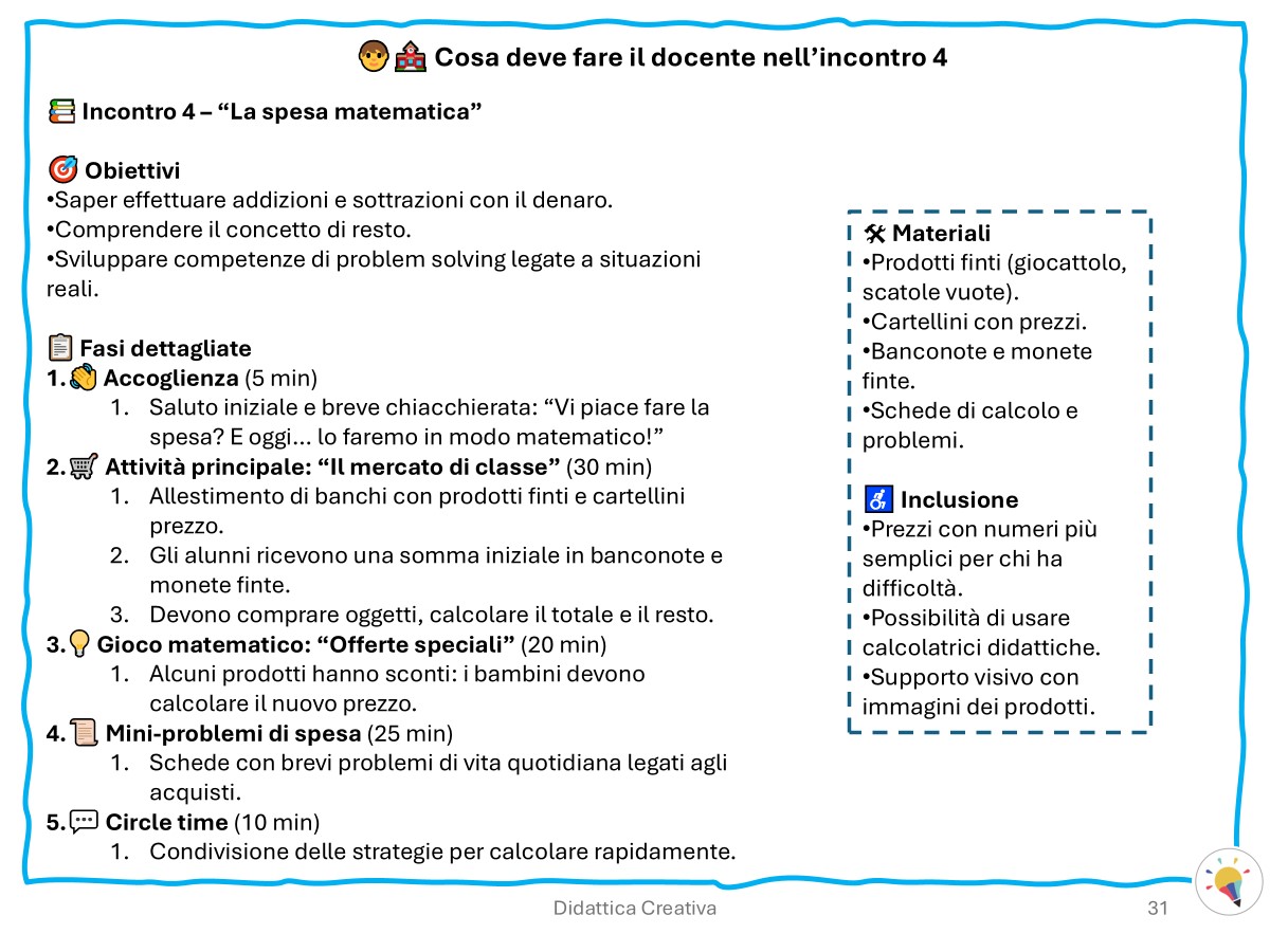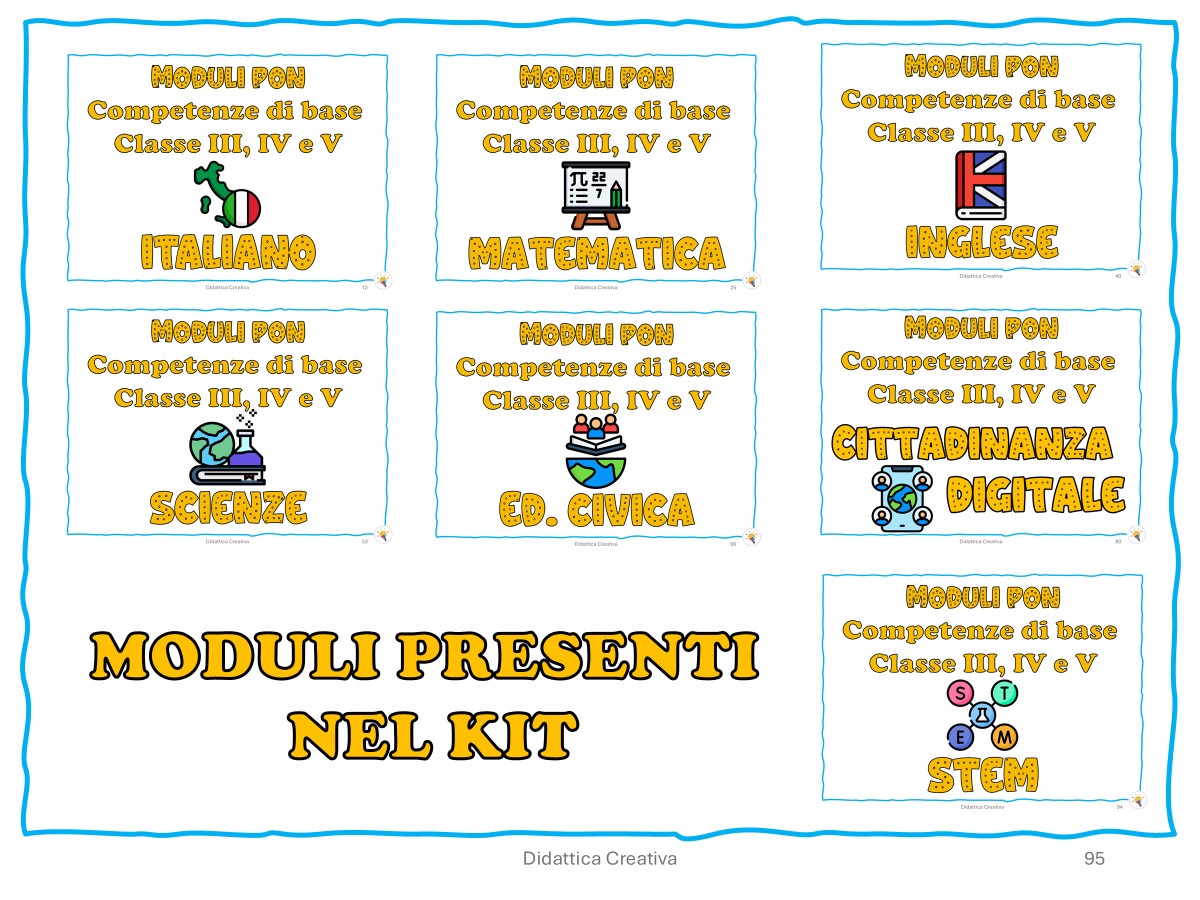 Nel libro (109 pagine) sono inclusi 7 moduli già sviluppati, ognuno articolato in 10 incontri dettagliati, pensati per valorizzare l’apprendimento attraverso esperienze pratiche, inclusive e motivanti.