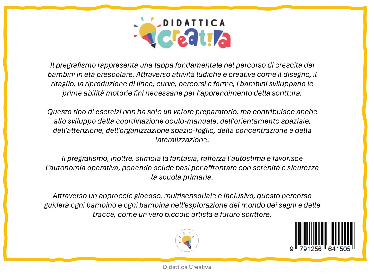 Il pregrafismo rappresenta una tappa fondamentale nel percorso di crescita dei bambini in età prescolare. Attraverso attività ludiche e creative come il disegno, il ritaglio, la riproduzione di linee, curve, percorsi e forme, i bambini sviluppano le prime abilità motorie fini necessarie per l’apprendimento della scrittura.